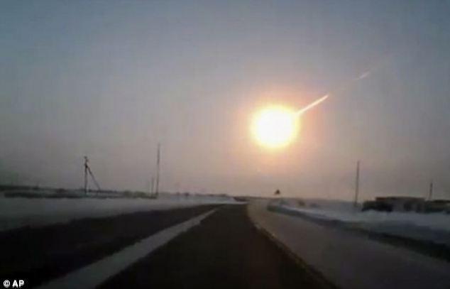 图为2013年车里雅宾斯克陨石坠落,发出巨大耀眼亮光。